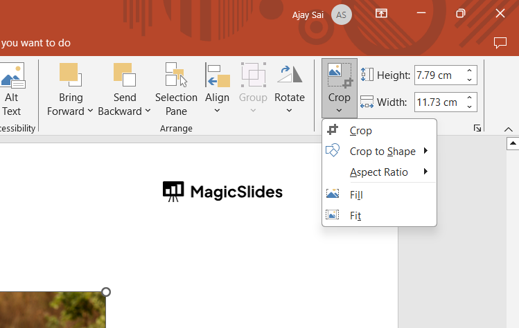 In the “Picture Format” tab, click on the “Crop” dropdown button in the "Size" group.