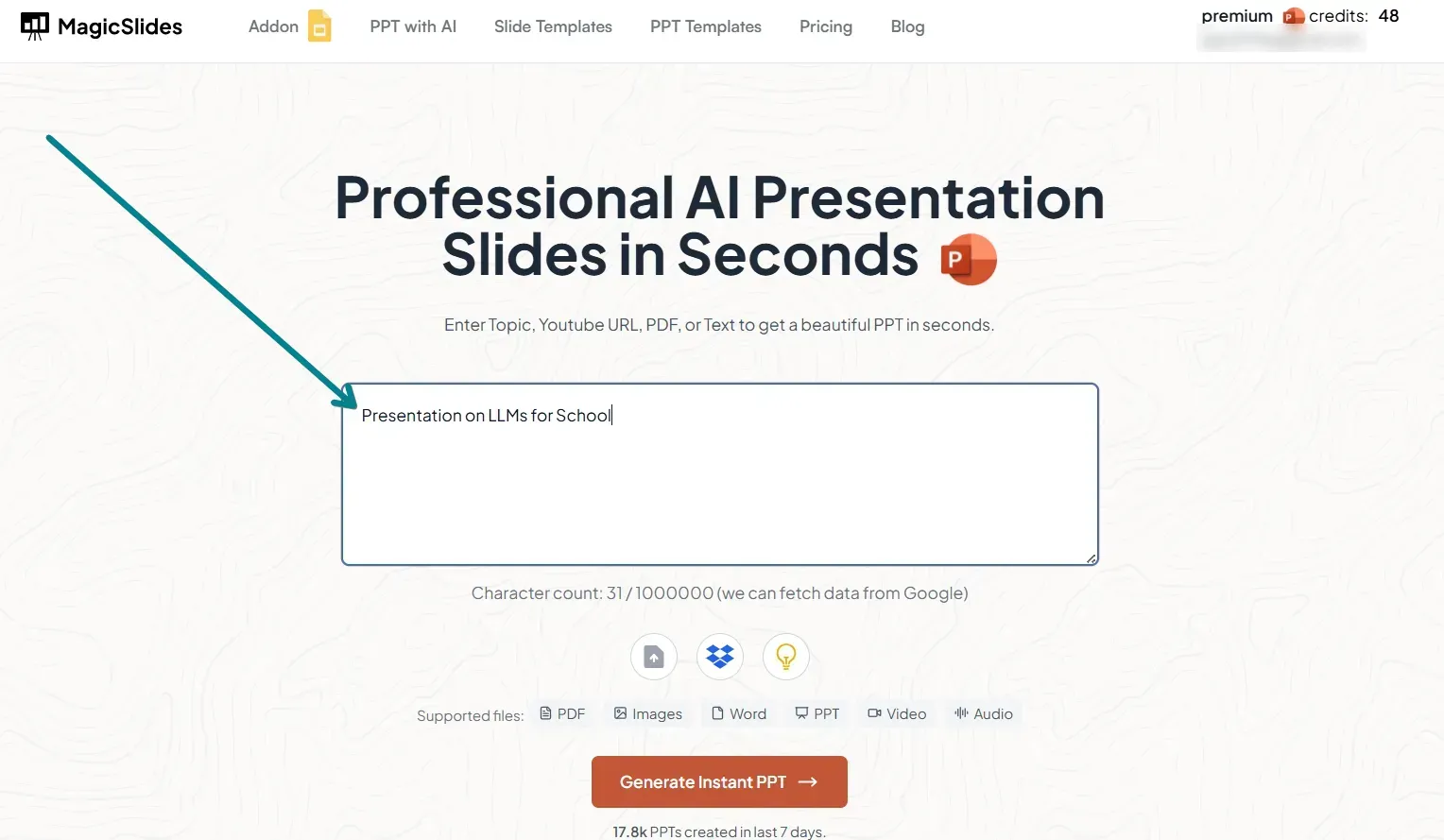 Enter Your Topic: Once logged in, type the topic of your presentation into the MagicSlides.app input bar. Whether it’s a business presentation, educational topic, or creative pitch, MagicSlides.app will generate content that fits your needs.