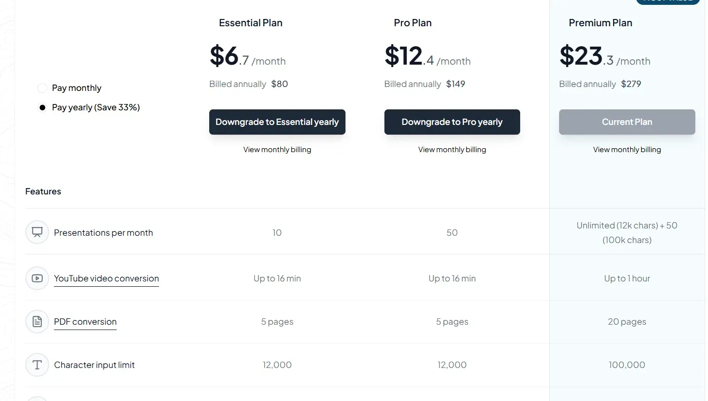 Upgrade for More Features: MagicSlides.app also offers premium plans with advanced features such as exporting YouTube videos to slides or transforming URLs into presentations. Check out MagicSlides Pricing for more details.