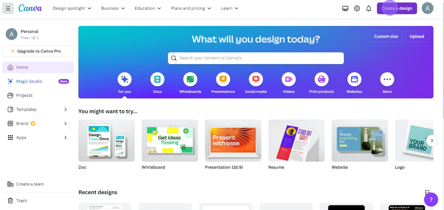 Once you're logged in, click on the "Create a design" button in the top right corner of the screen.