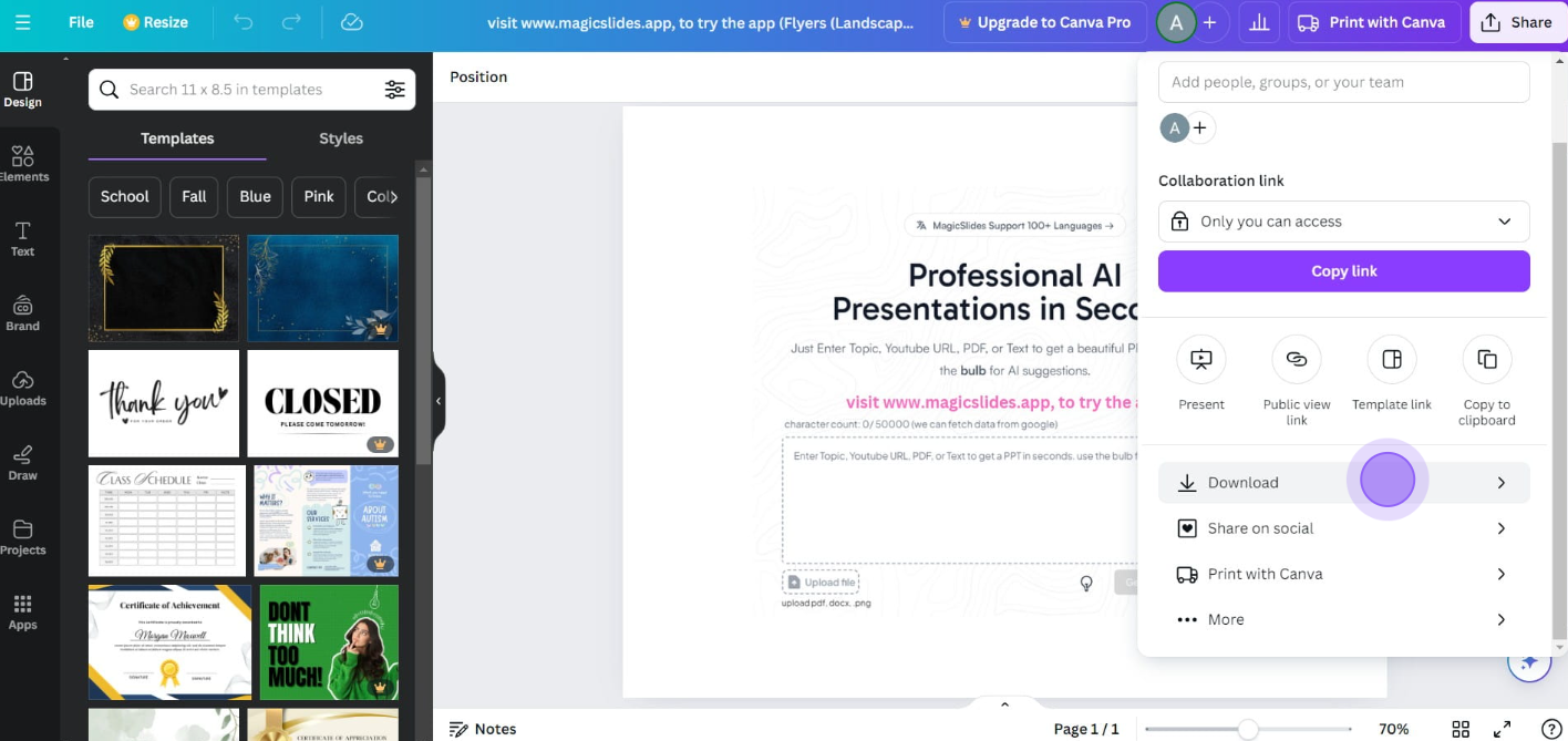 Click on the “Share” button in the top right corner of the Canva interface, then select “Download” from the dropdown menu.