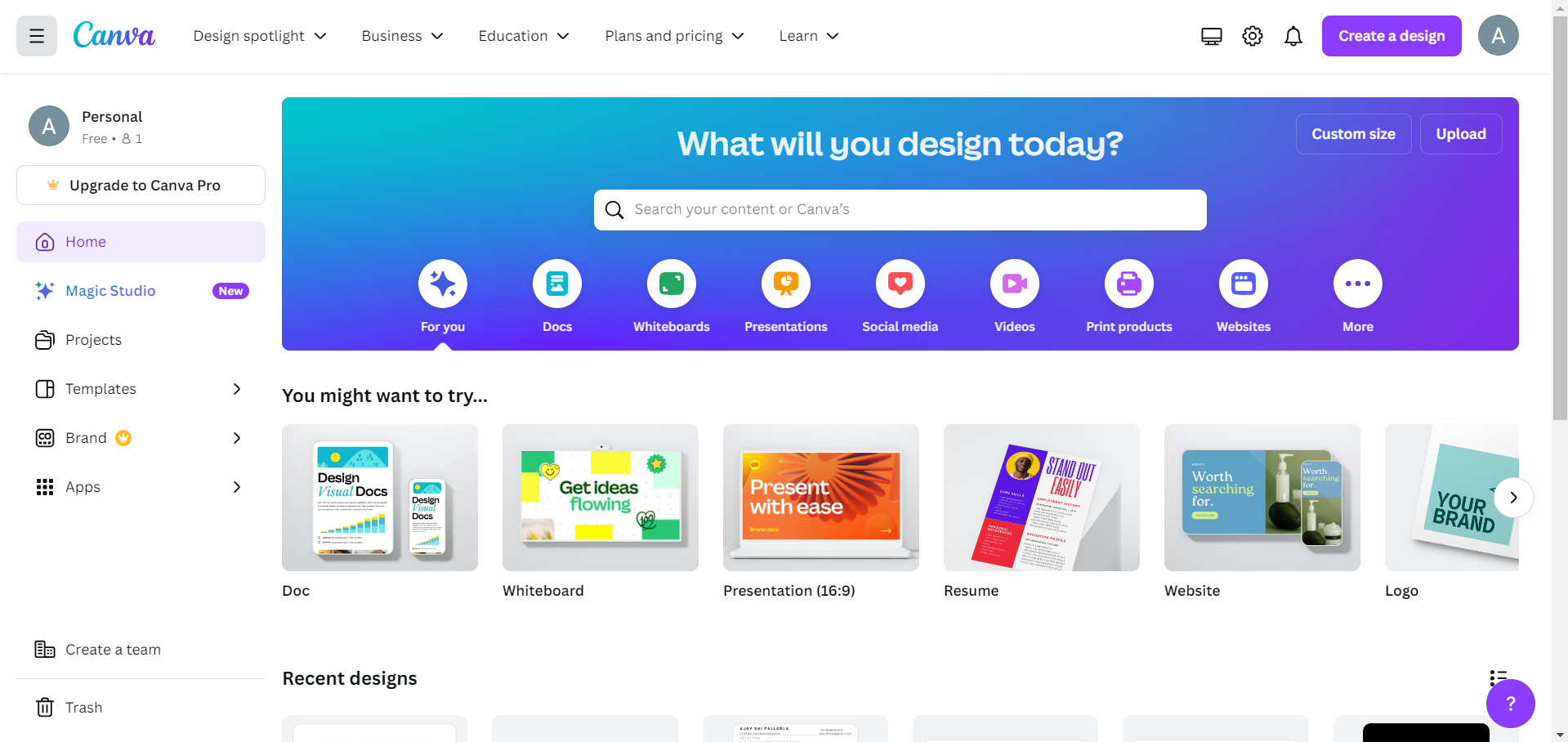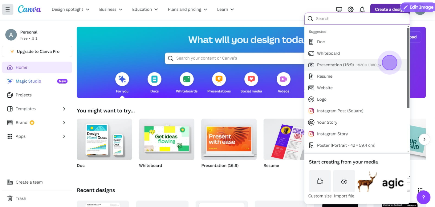 You can either select a pre-sized template (e.g., logo, presentation, social media post) or customize your dimensions by clicking "Custom Size."