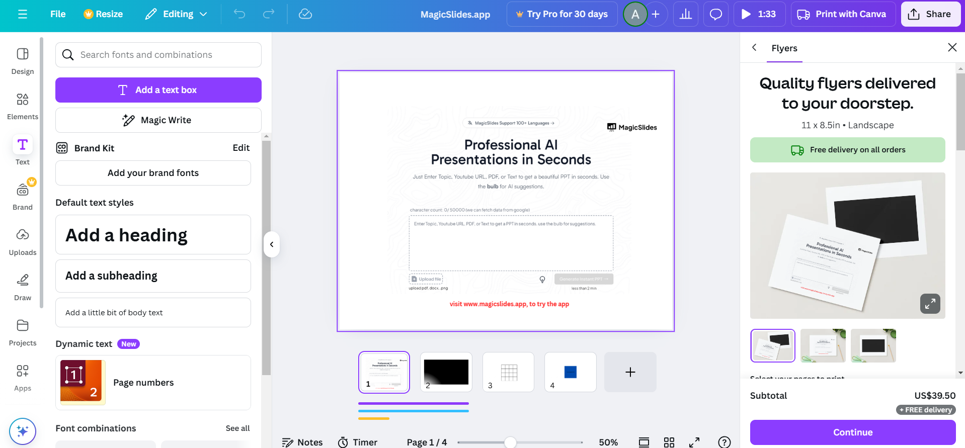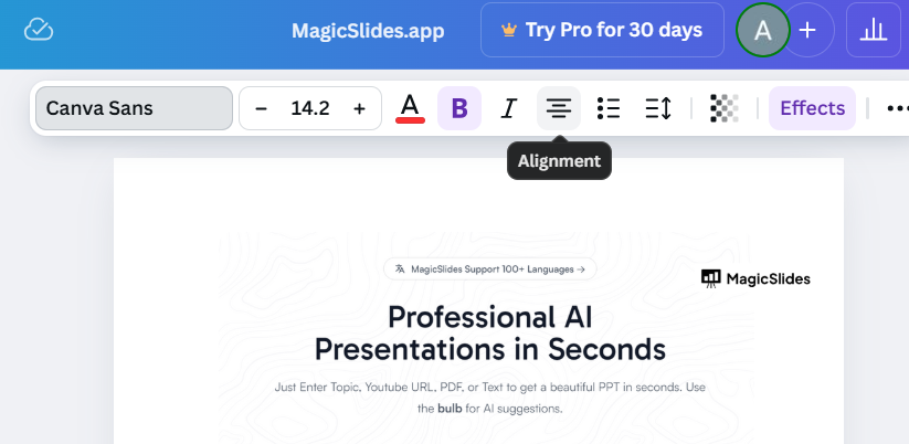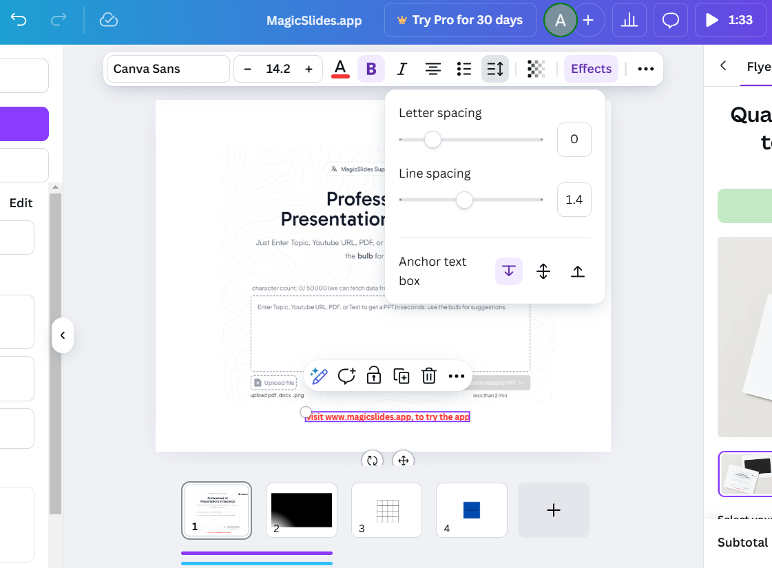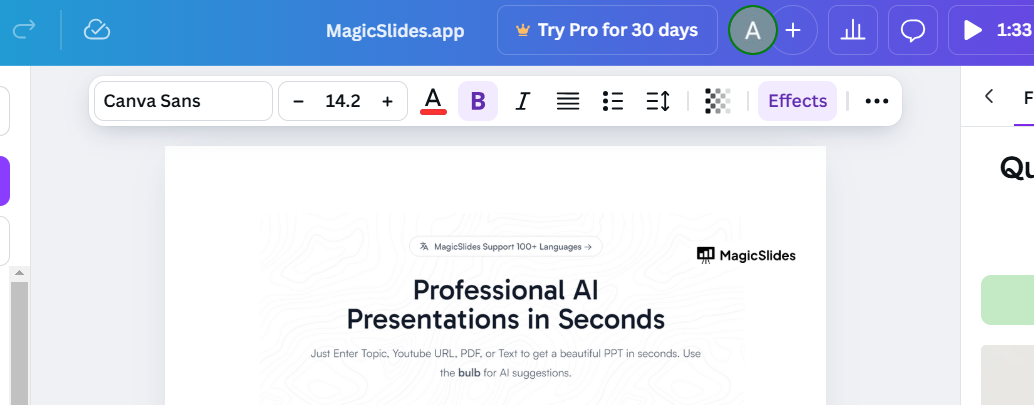 Adjusting font height in Canva adds a touch of personalization, but creating presentations can be even simpler. MagicSlides.app takes your input be it text, PDFs, or even a topic and instantly generates professional slides, including AI-crafted layouts for text and visuals. Try MagicSlides.app today and see how easy it can be!