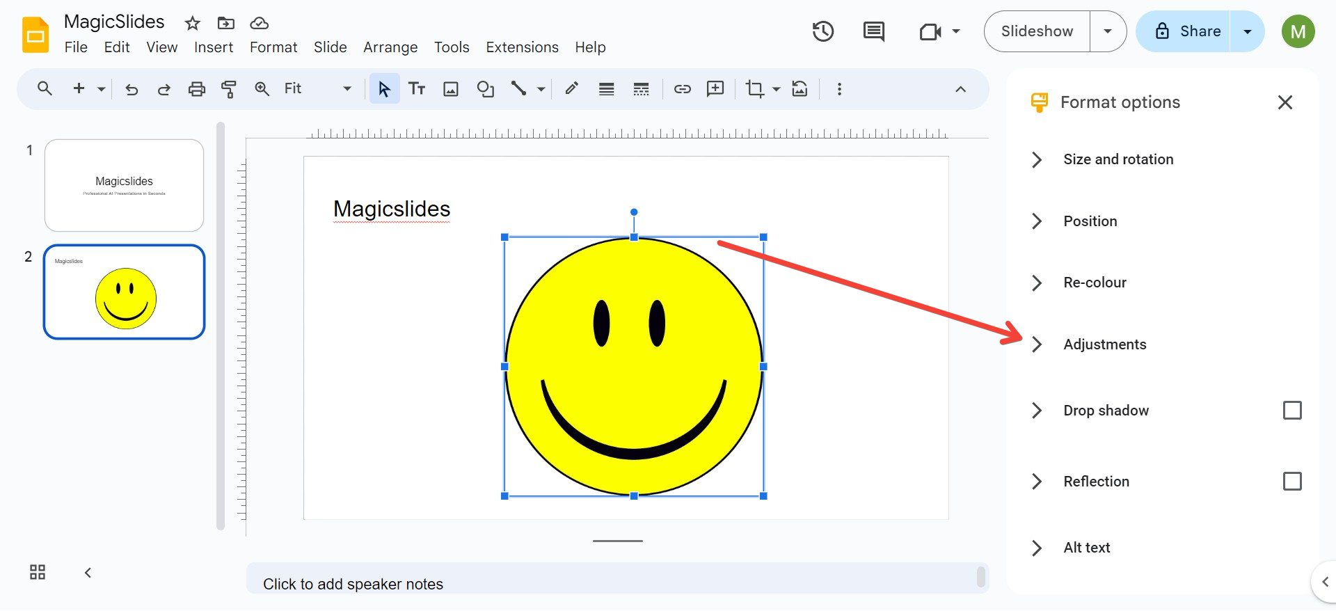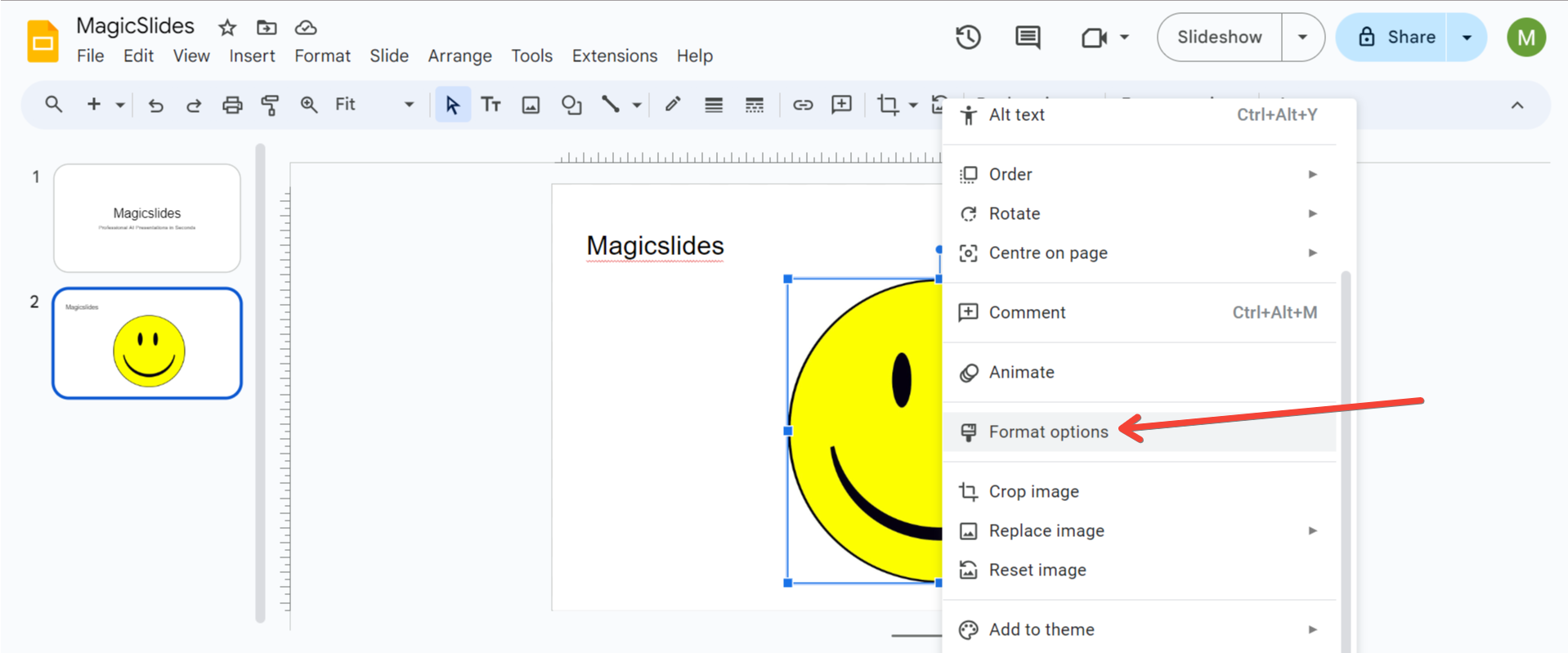 - Right-click on the image and choose Format options from the context menu. You can also find the Format options button in the toolbar at the top.