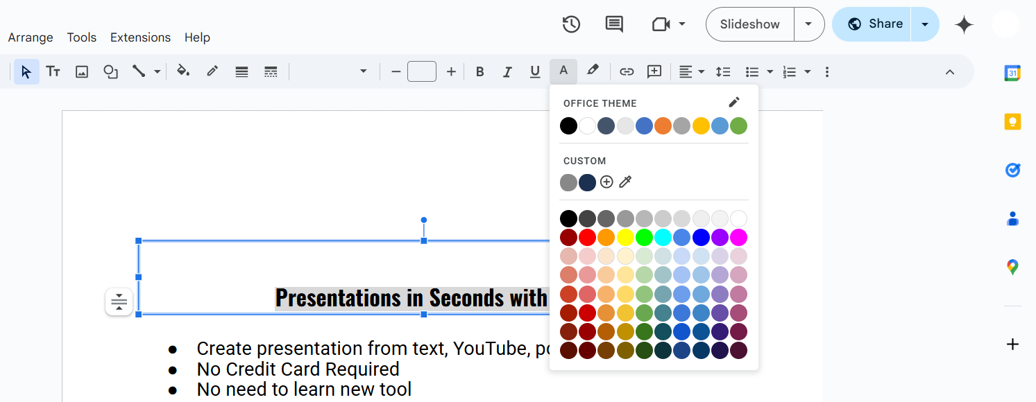Click on the Text color (A icon) or Fill color (paint bucket icon) in the toolbar.