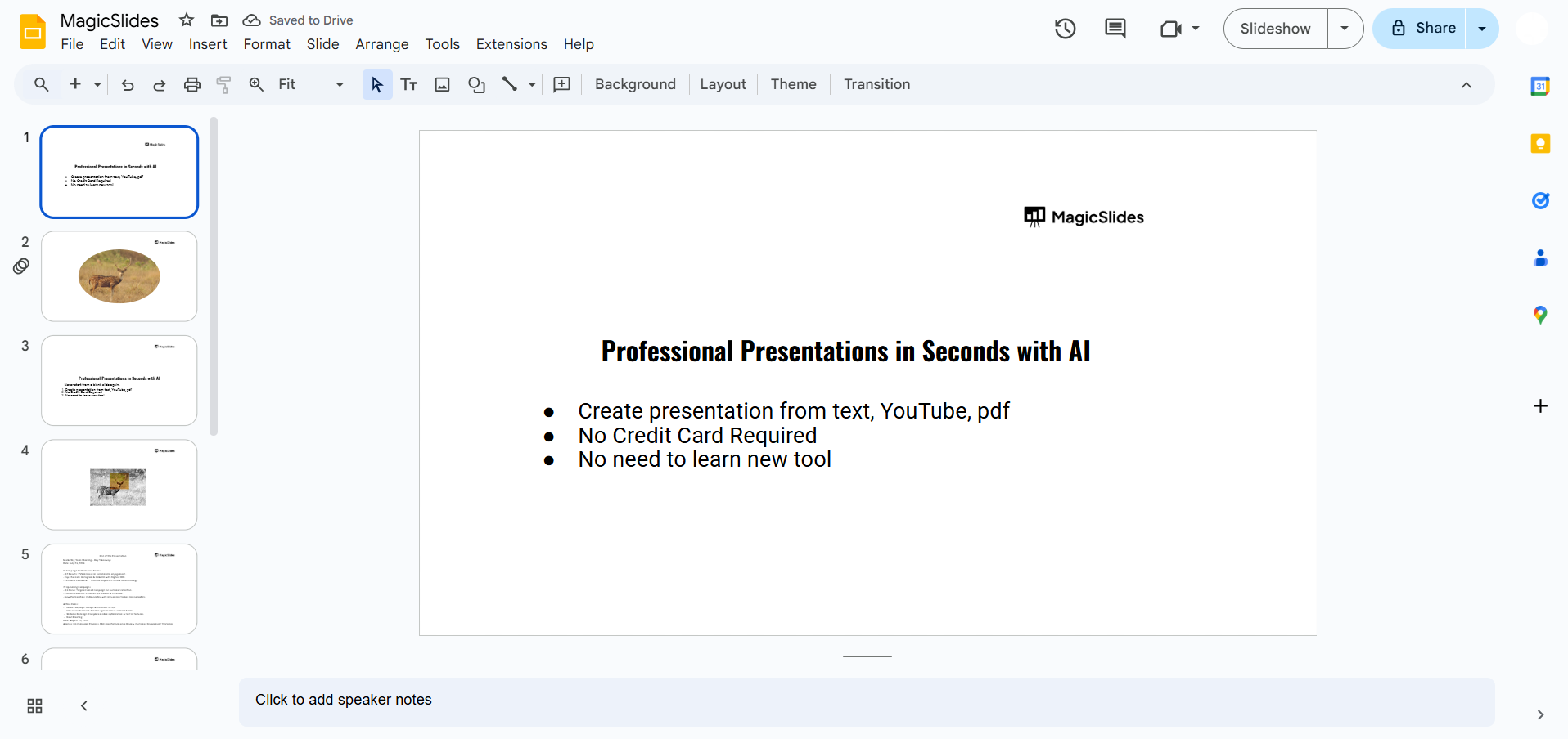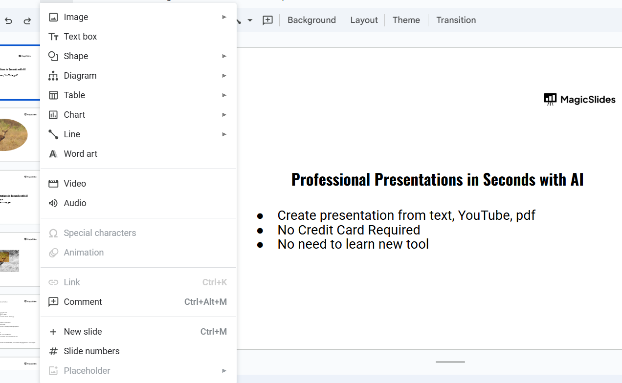 Log into your Google account and open the presentation where you want to add slide numbers.