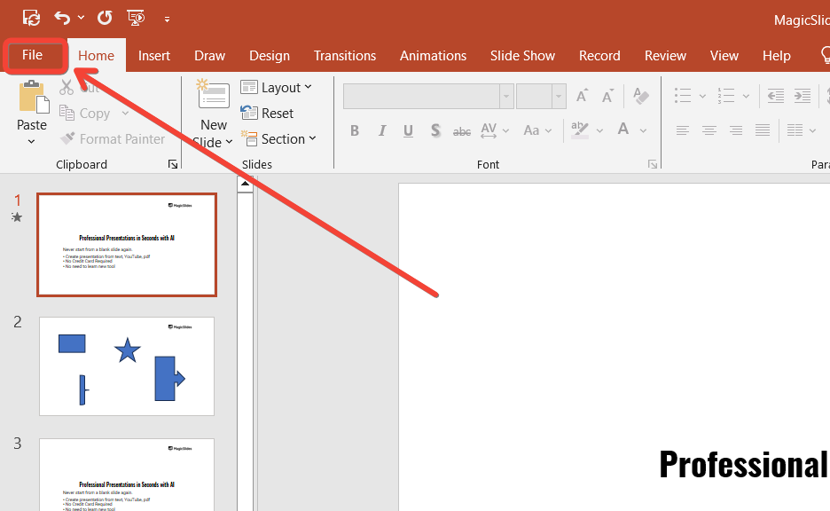Click on the “File” tab at the top left corner of the PowerPoint window.