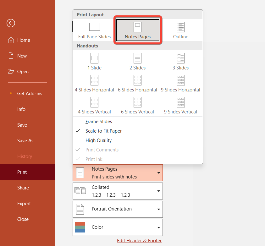 In the dropdown menu, select “Notes Pages.” This option will print each slide along with the accompanying notes below it.