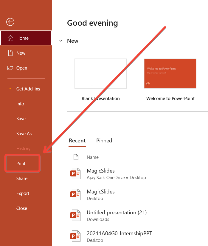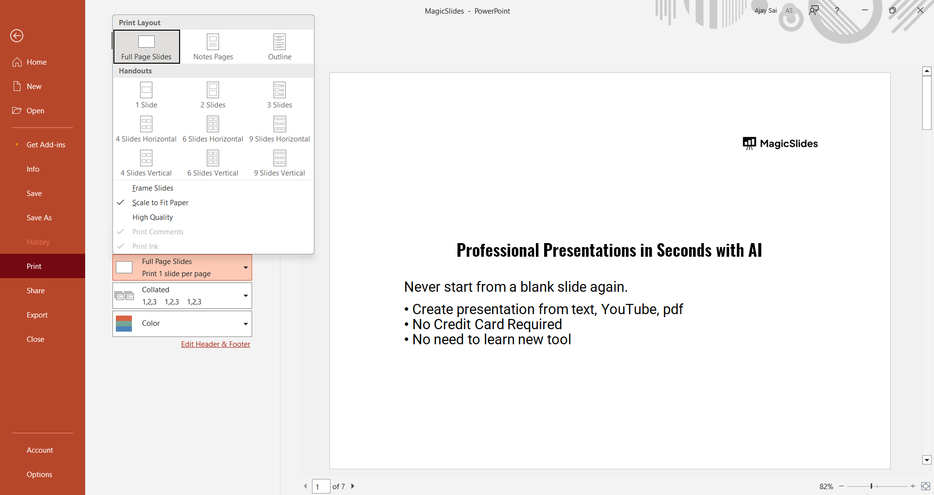 This will take you to the print settings page, where you can customize how your presentation will be printed, including the layout, number of slides per page, and notes.
