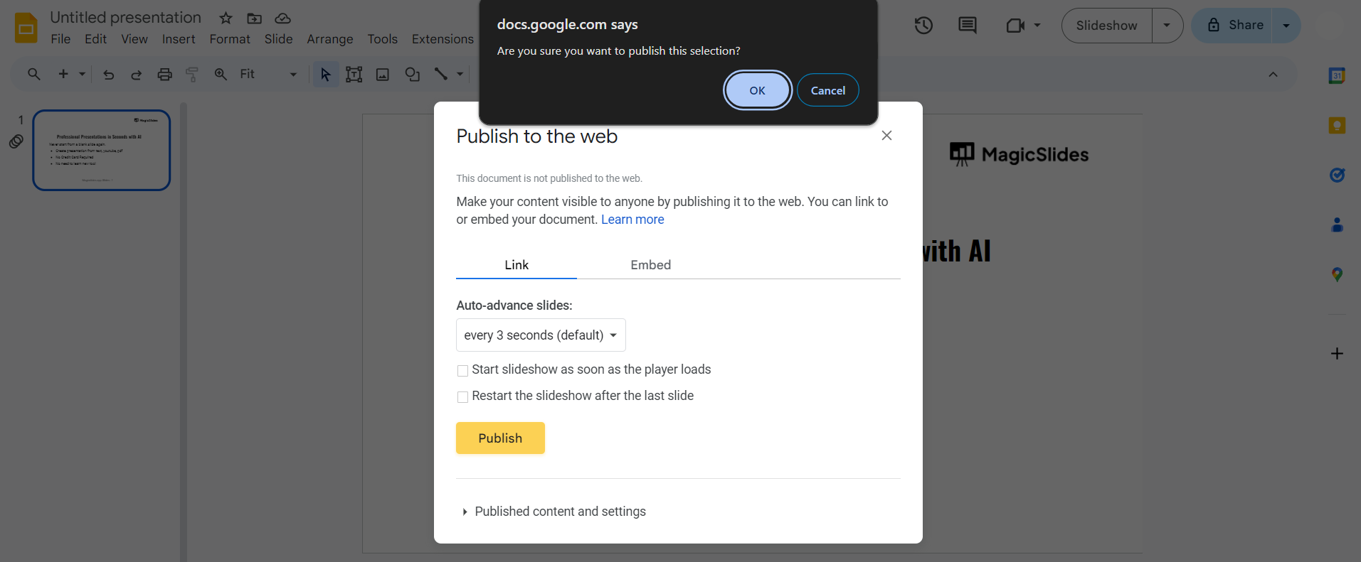 In the dialog box, select your desired publishing options. You can decide whether to publish the entire presentation or just a specific slide. Set the auto-advance options if needed.
