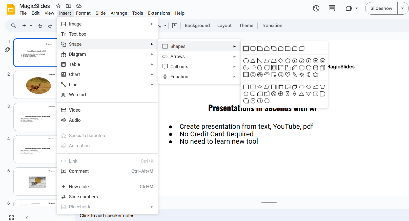 Go to the “Insert” menu at the top of the screen. Hover over “Shape” and select a shape from the options (e.g., rectangle, circle, arrow).