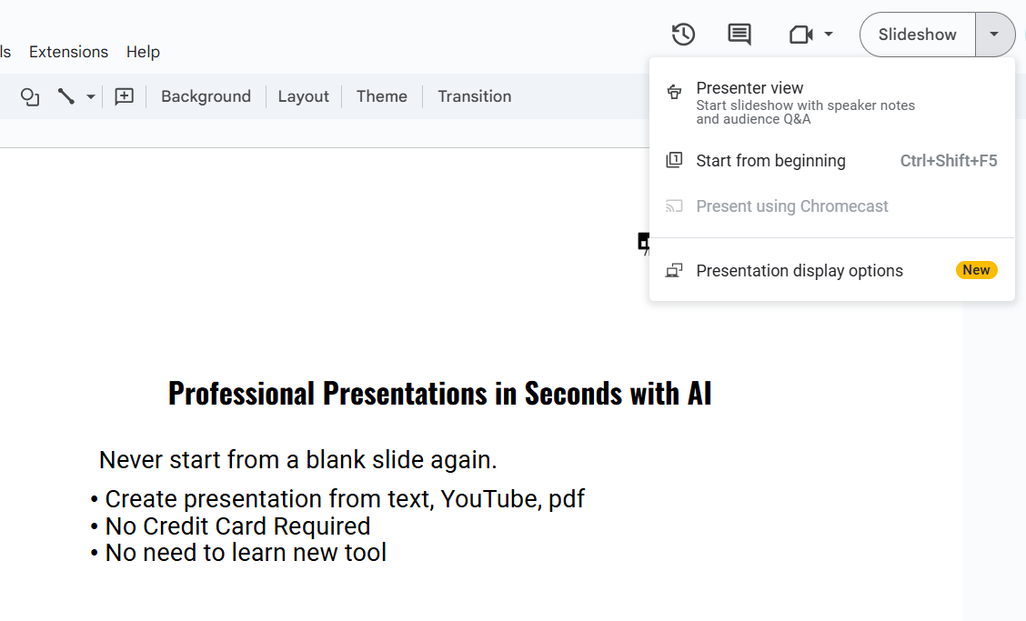 In Google Slides, click "Present" to start your presentation.