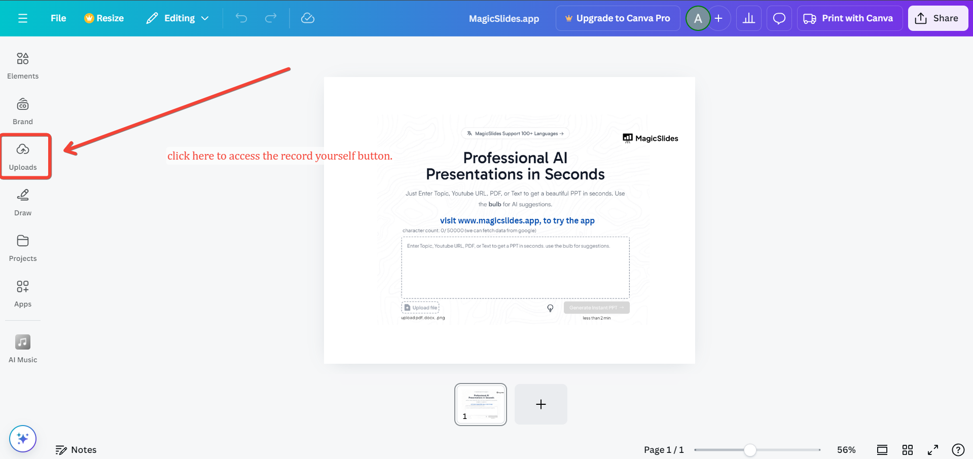 This makes it much easier to move directly to Canva for recording, rather than spending time on slide creation. However, you can also add voice, music, and video to PPT via this MagicSlides solution. For the same, you just have to upload your voice file, and write a text like “add uploaded voiceover in this presentation,” and the rest will do automatically.