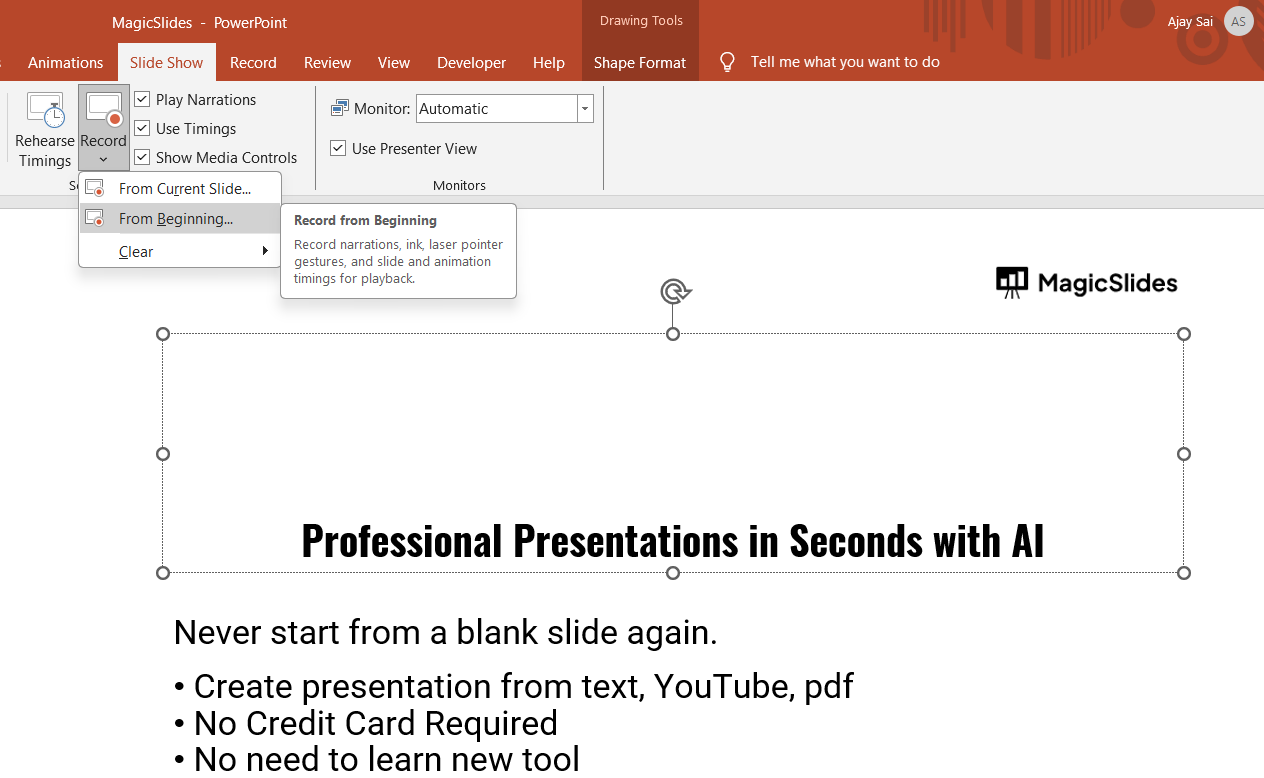 Choose Record from Beginning or Record from Current Slide based on where you want to start recording.