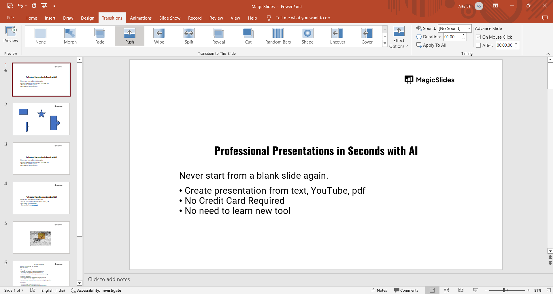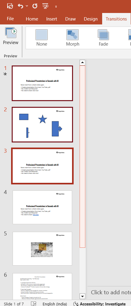 Keep in mind that while transitions can be effective, less is often more when it comes to professional presentations.