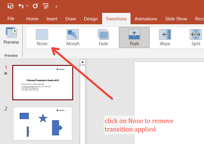 To remove the transition from the selected slide, click on "None," which is typically the first option in the transition gallery.