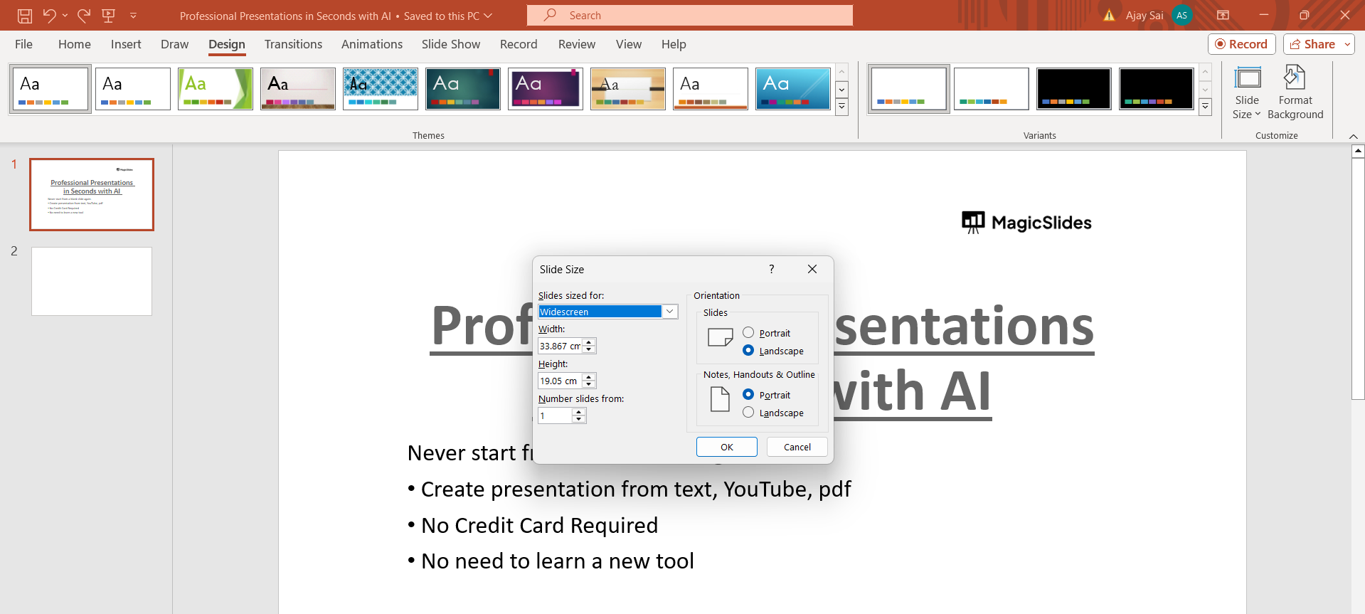 Click on the rotation option you've chosen, and the selected slide will rotate accordingly. You can continue to click on the rotation option multiple times to achieve the desired orientation, you can also rotate or oriente the slide by clicking on custom sizing.