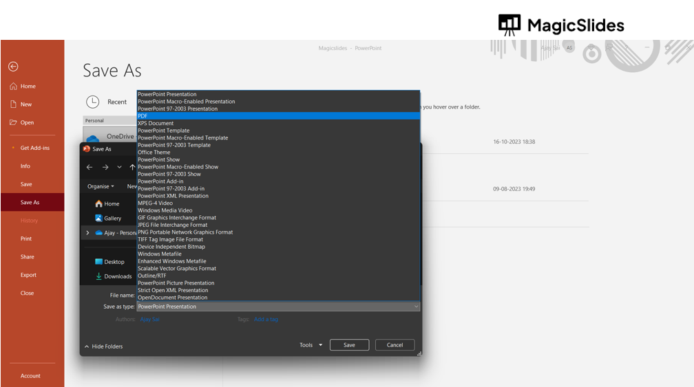 → Click "Save" or "Export": Once you've selected the location, format, and adjusted any optional settings, click the "Save" or "Export" button. PowerPoint will save your presentation as a PDF in the chosen location.