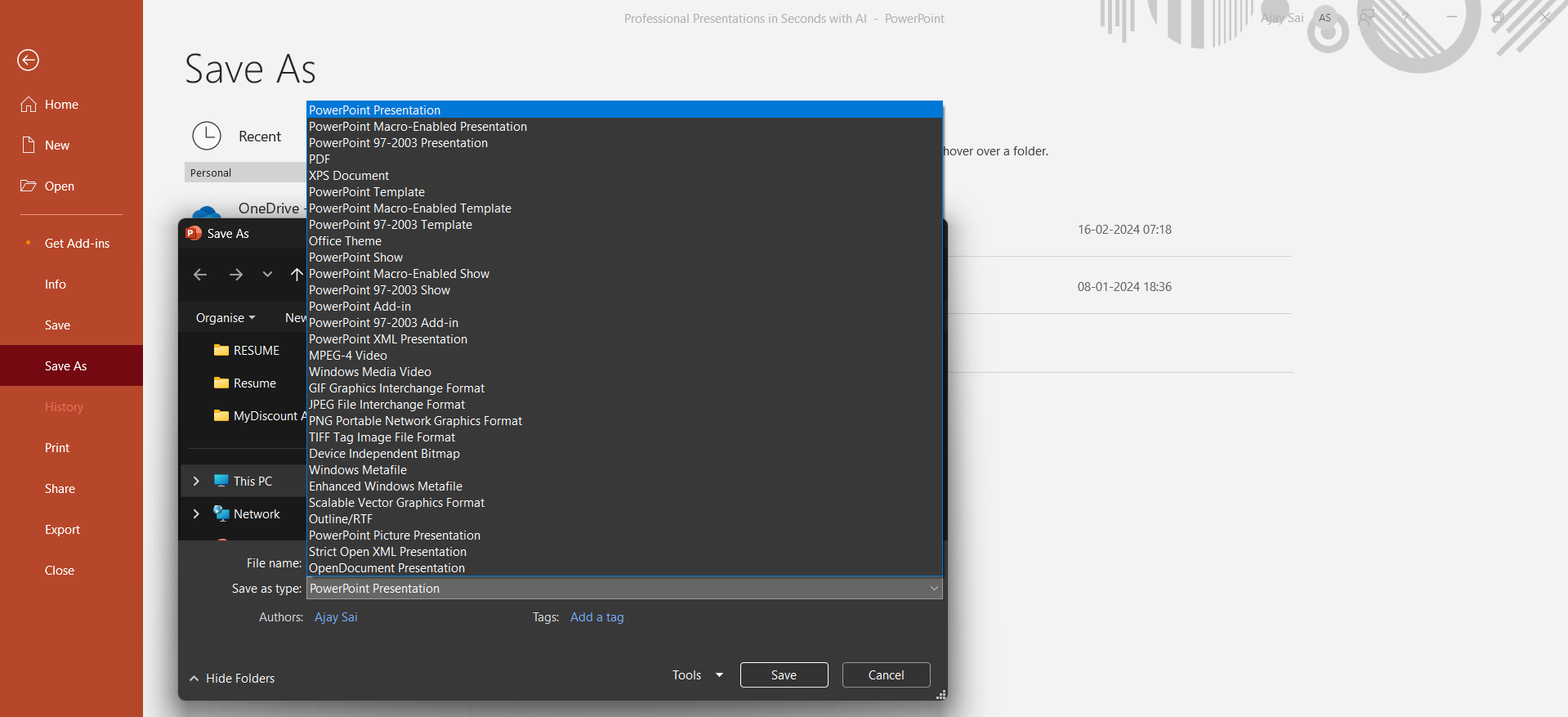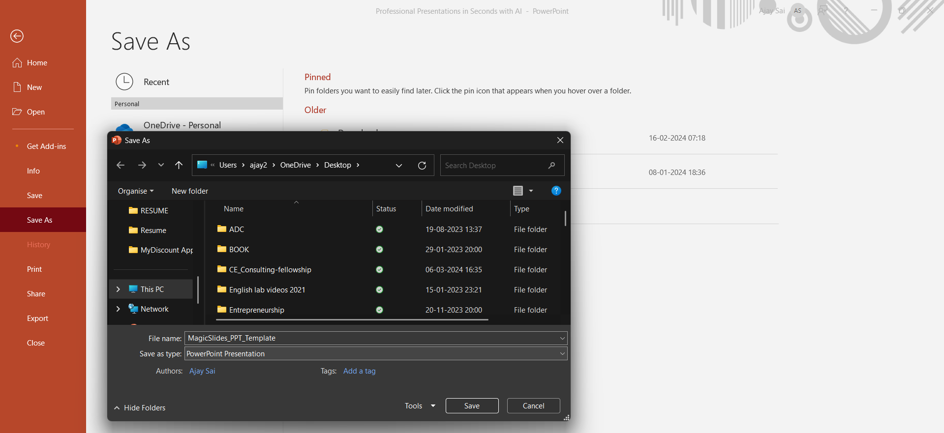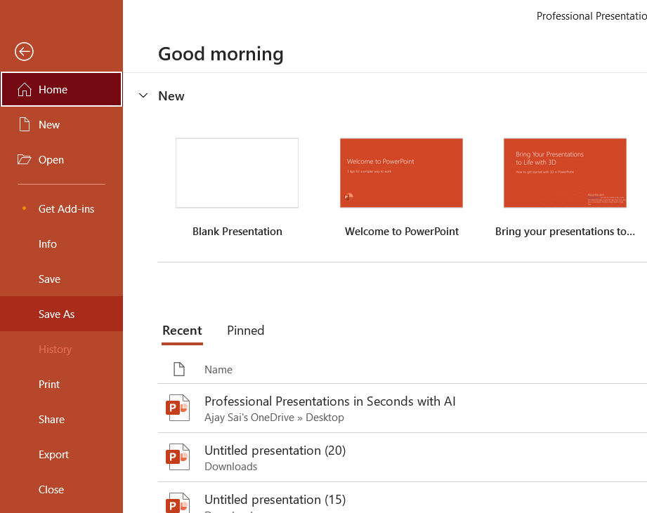 After finalizing your design, go to the "File" menu in the top-left corner of the PowerPoint interface. Click on "Save As" to open the save options.