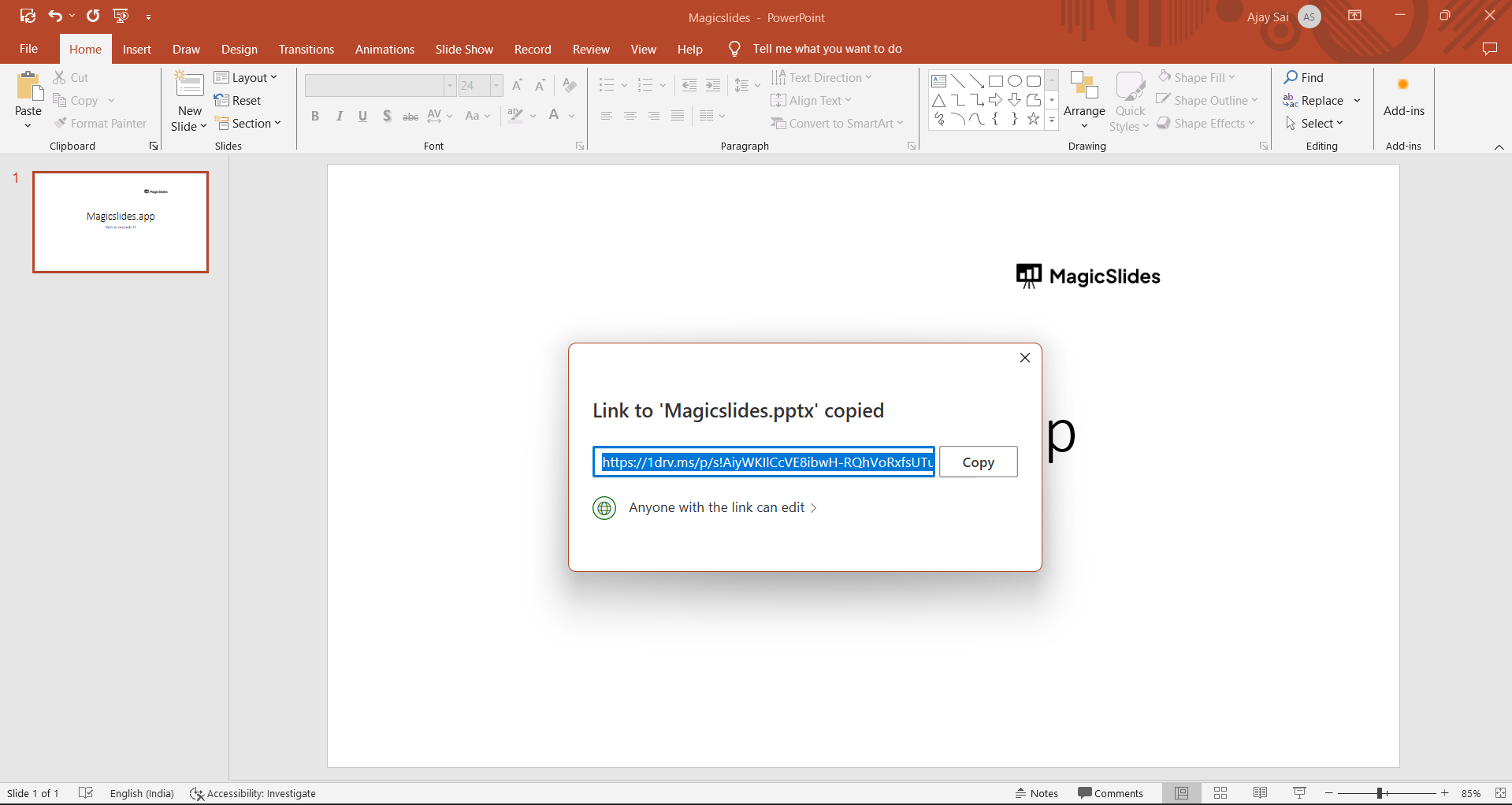 With the shareable link copied to your clipboard, you can now share it with your intended audience. You can send it via email, messaging apps, or any other communication method you prefer. People who receive the link will be able to access and view your presentation online.