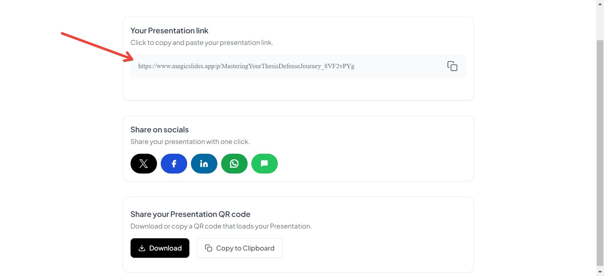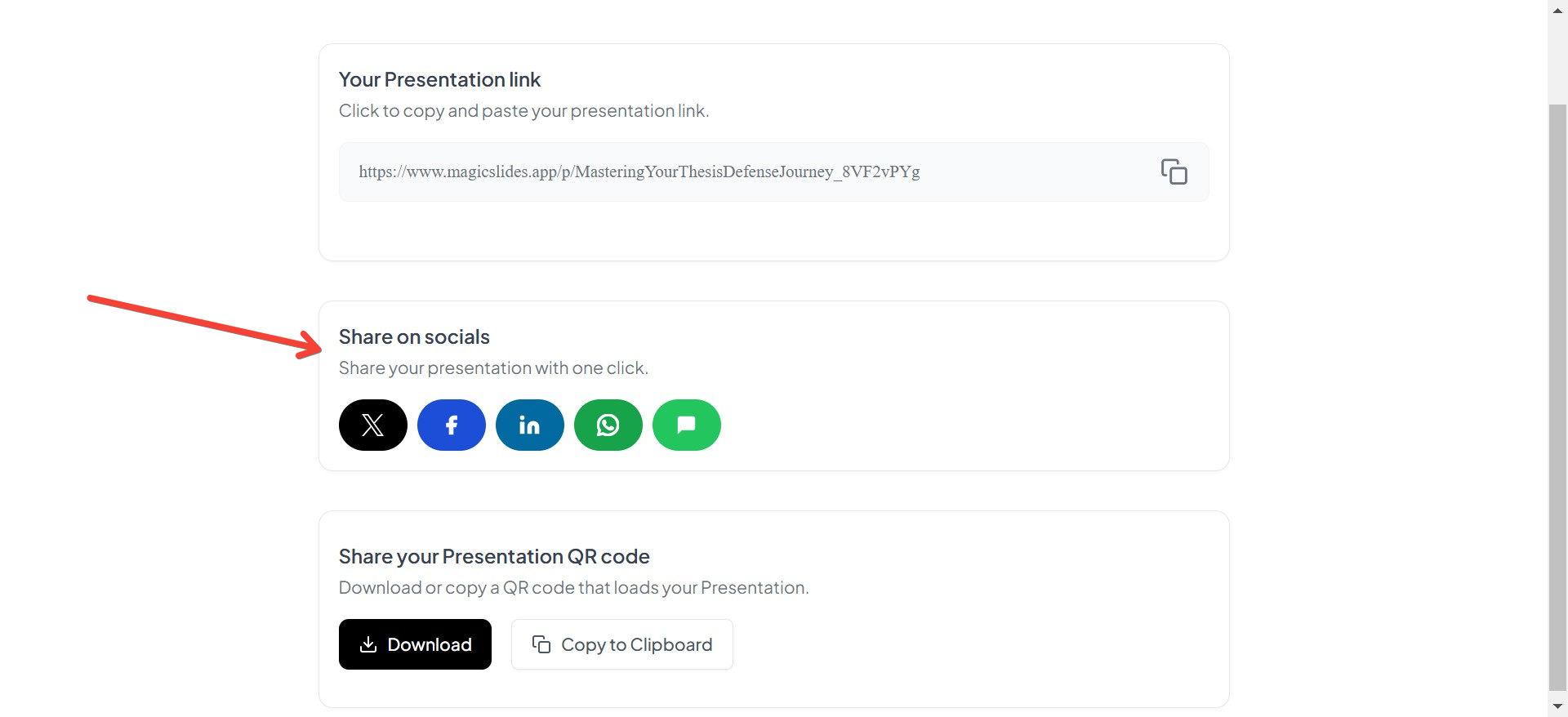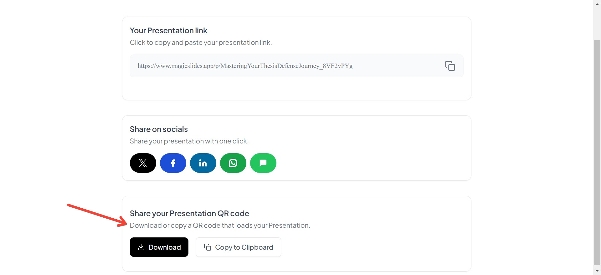 MagicSlides isn’t just a tool for creating presentations—it’s designed to make sharing seamless and effective. By offering multiple options like downloads, links, QR codes, and social sharing, it adapts to your specific needs and ensures your presentations leave a lasting impression.