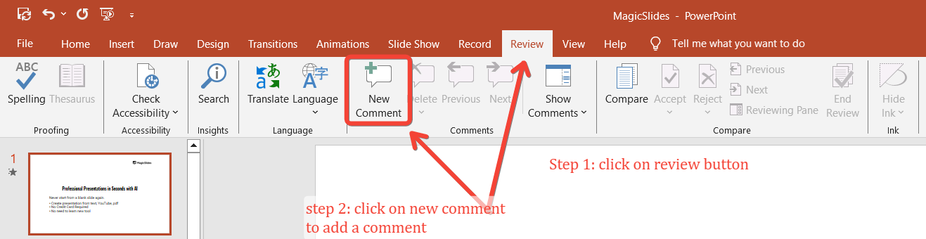 To add a comment, select the text, image, or object you want to comment on, then go to the "Review" tab and click on "New Comment."