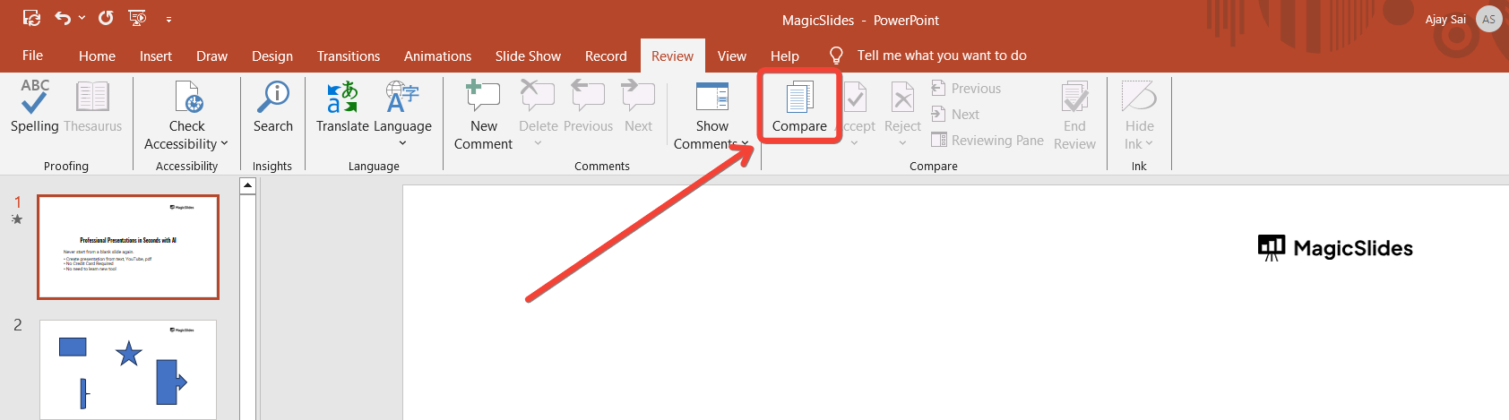 To do this, open your original presentation, go to the "Review" tab, and click on "Compare."