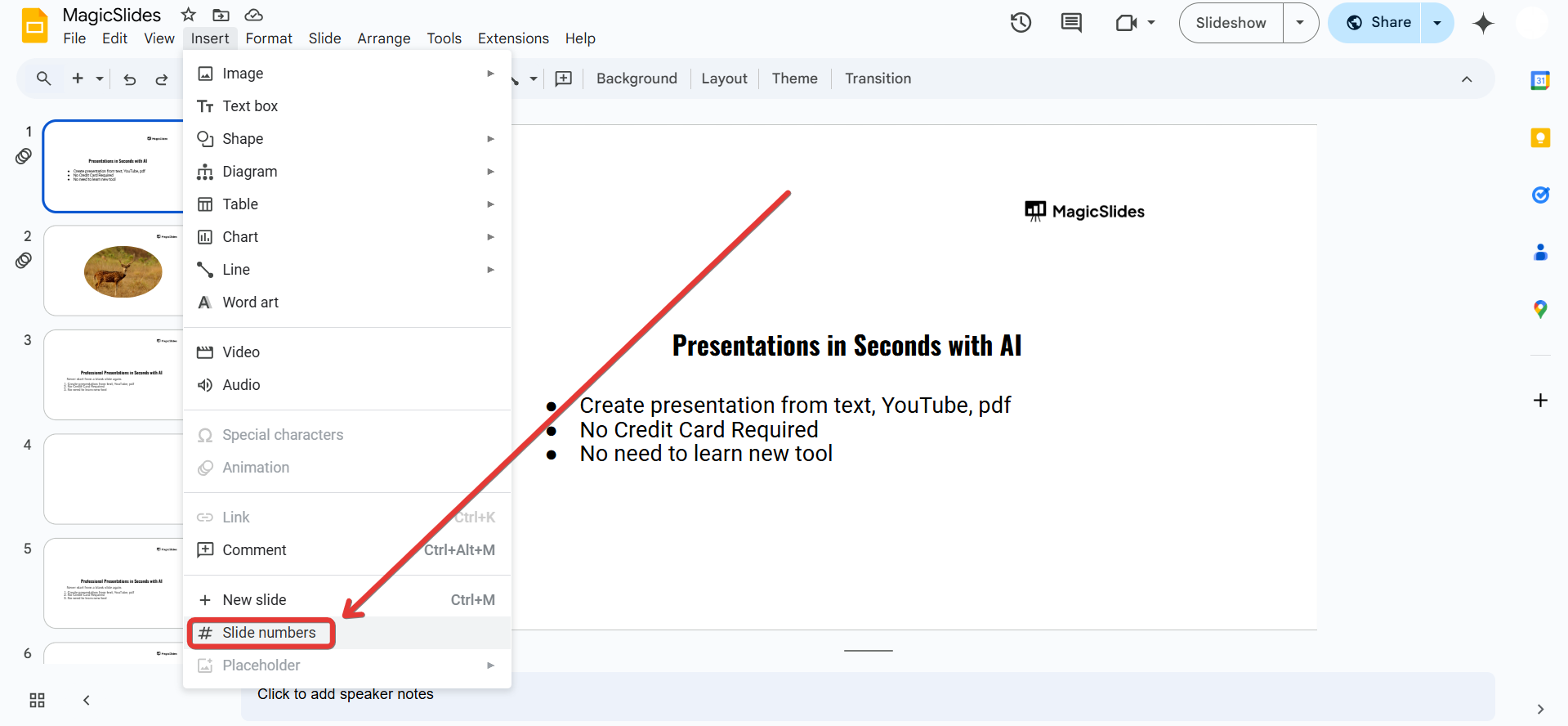 Click on Insert in the top menu bar. From the dropdown menu, select Slide numbers.