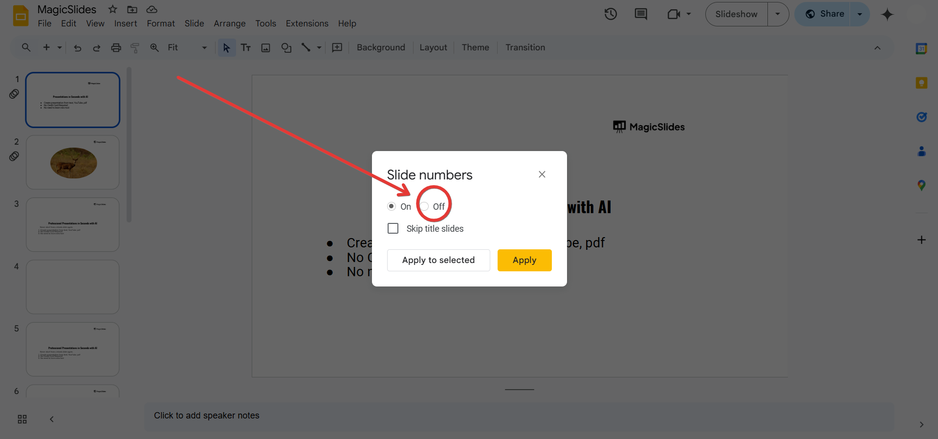 If you only want to remove numbers from specific slides, click "Apply to selected" after selecting those slides.