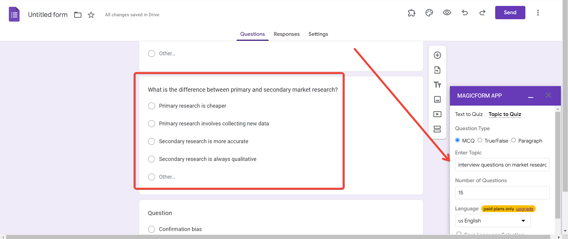 Click "Generate Questions," and witness the AI capabilities of MagicForms in action. The platform creates a set of market research questions tailored to your chosen field and language, optimizing the survey for meaningful insights.