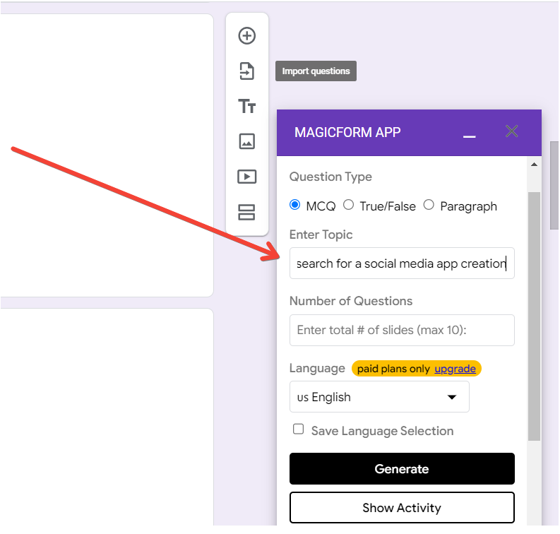 Access MagicForms through Google Forms' Add-ons menu. Running the app within Google Forms provides a user-friendly interface for effortless market research question creation.