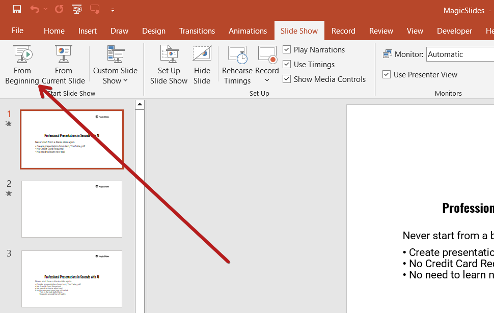 - Click From Beginning or From Current Slide in the Slide Show tab.