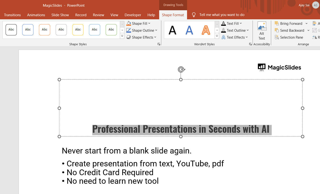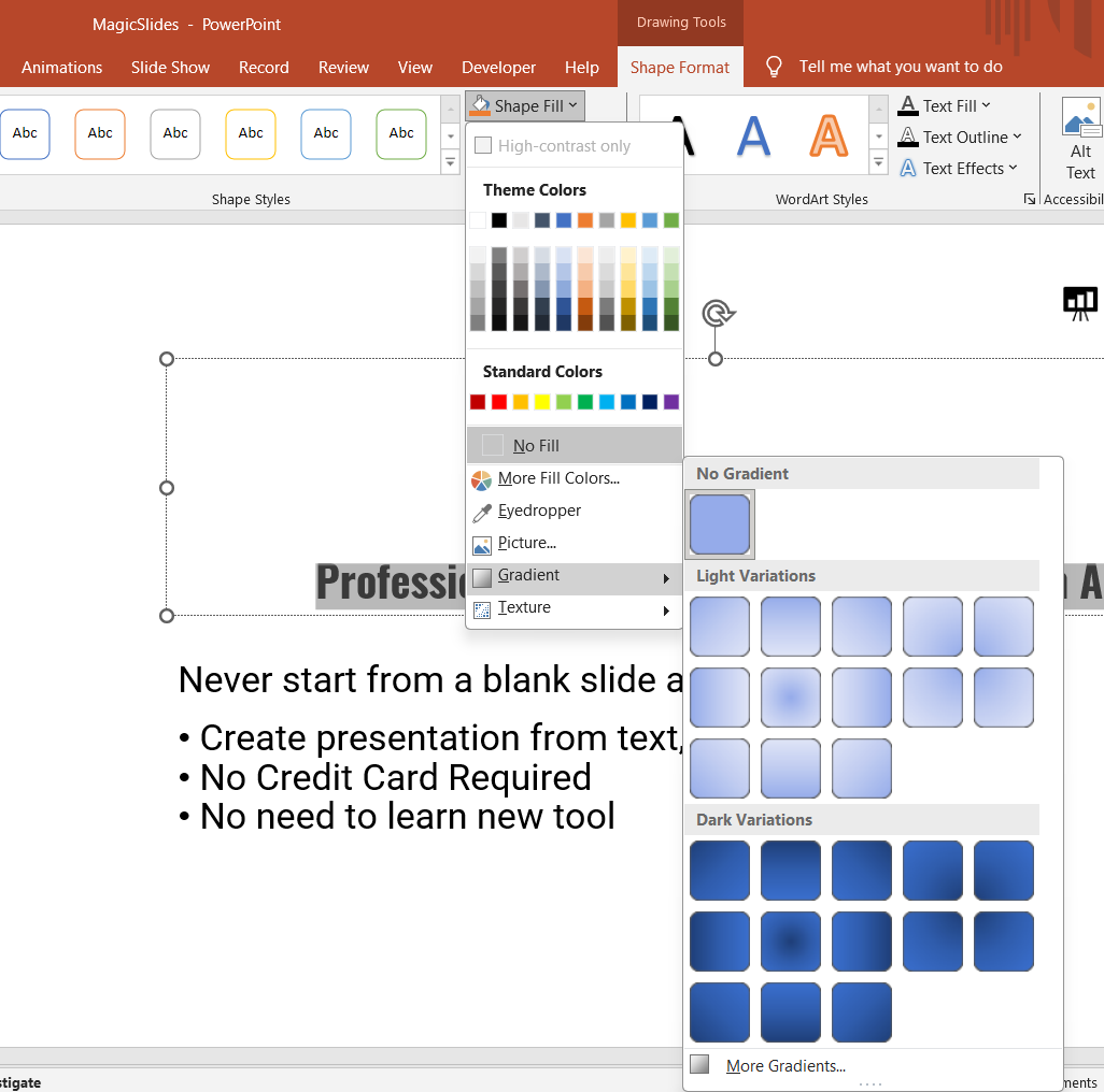 Select the text you want to add a shadow to. Navigate to the “Format” tab in the top toolbar.