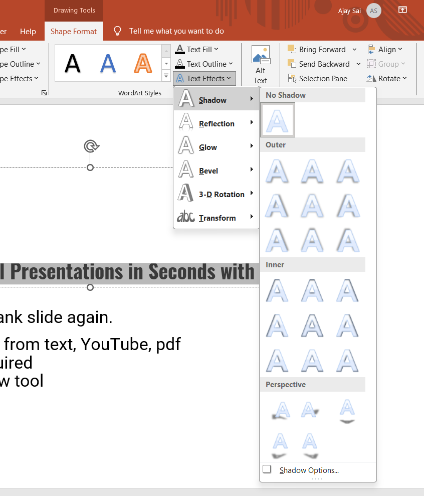 Click “Text Effects” and select “Shadow” from the dropdown menu.