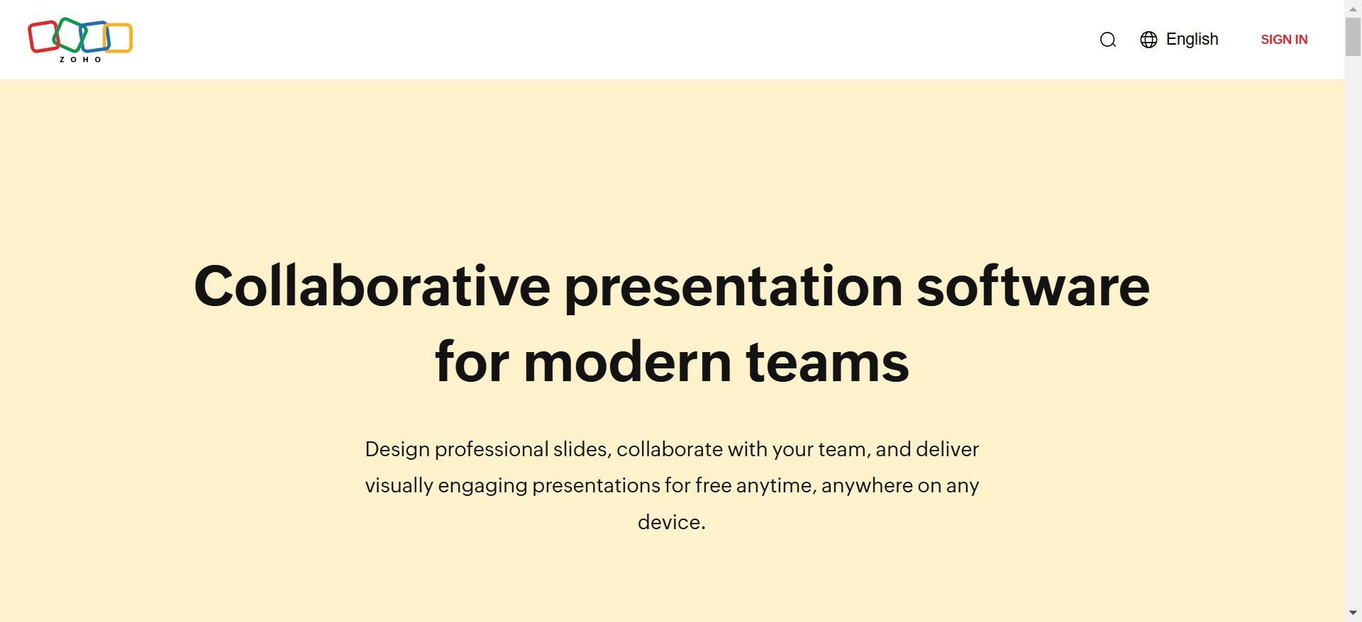 Zoho Show is a cloud-based tool offering a range of features to create, edit, and present slideshows. Its smooth interface makes it a great option for professionals.