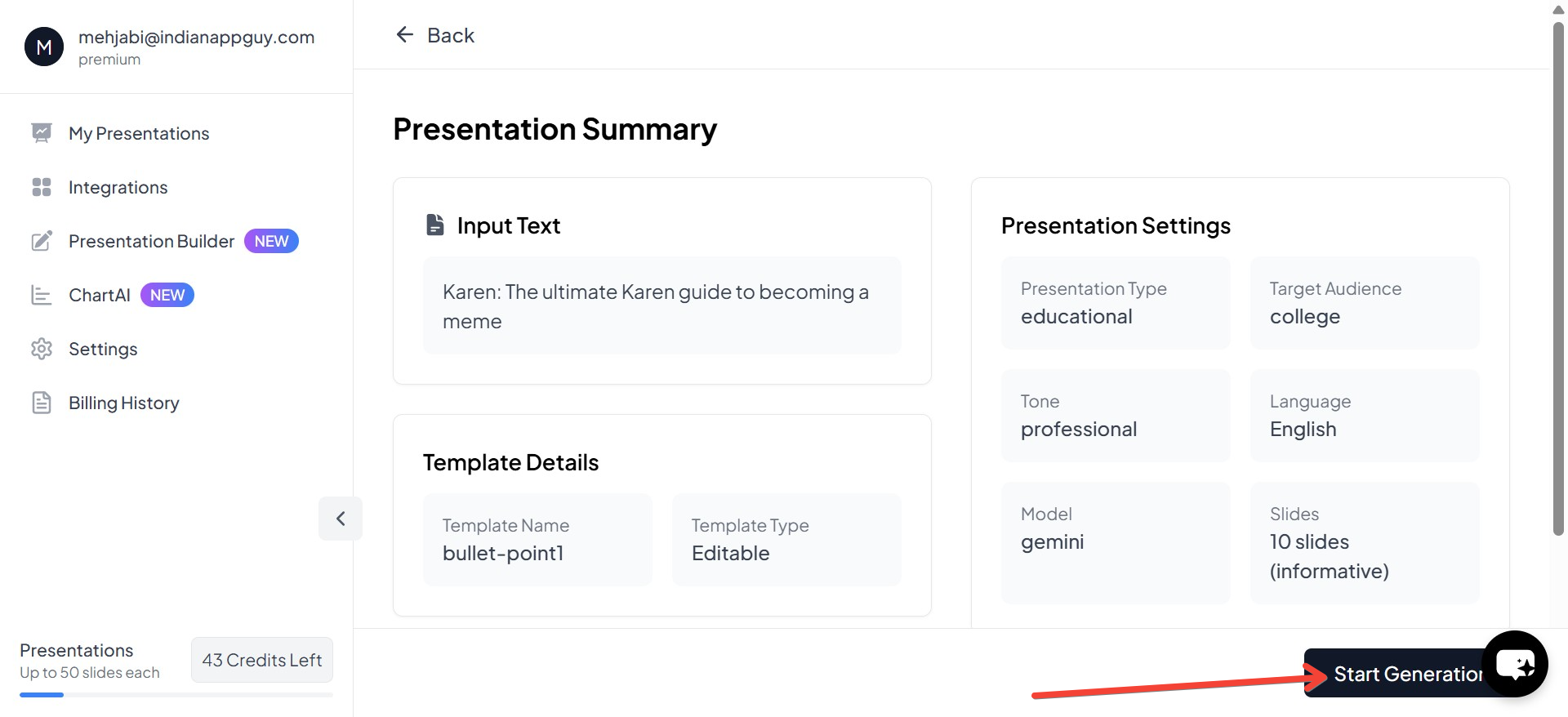 - Click "Start Generation" to let AI create the slides for you.