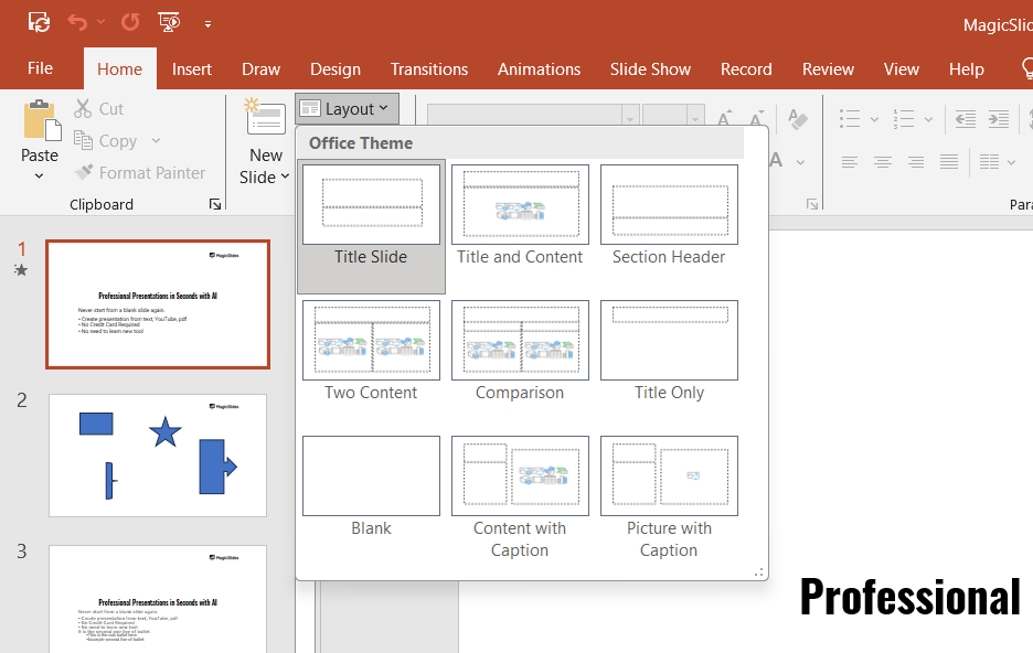 Browse through the available layouts, such as Title Slide, Title and Content, Two Content, Comparison, or Blank.