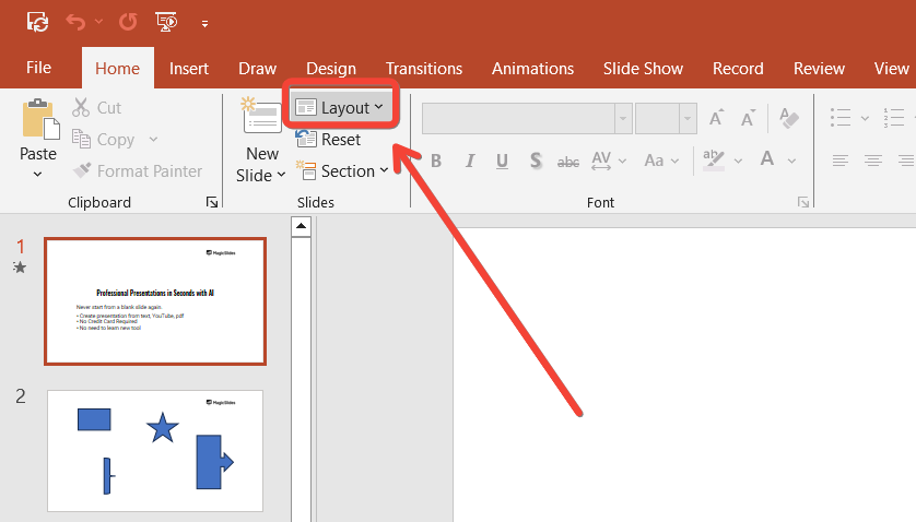 Click on the Layout button in the Slides group to open the Slide Layout menu.