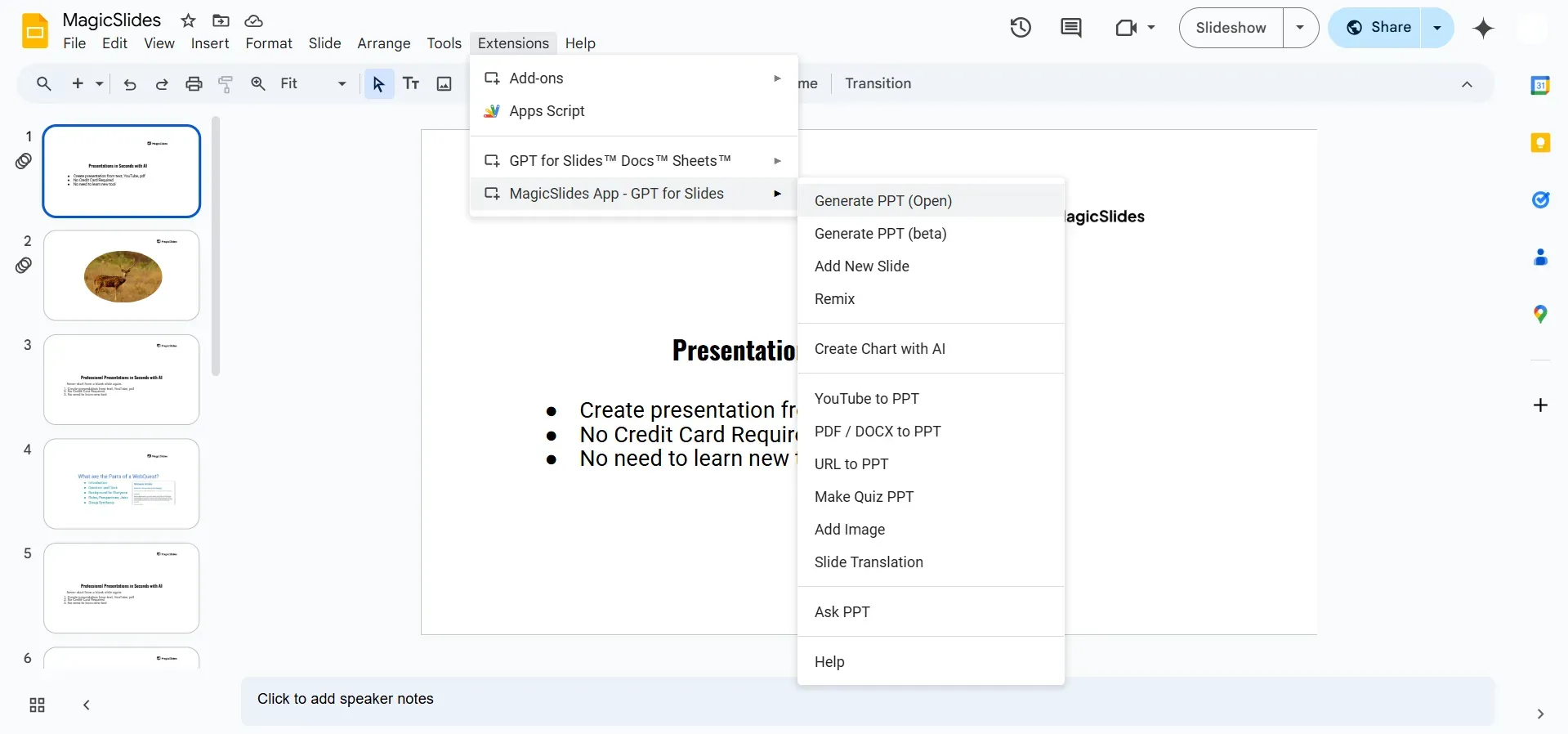 Launch MagicSlides – Click on Extensions > MagicSlides > Generate Presentation.