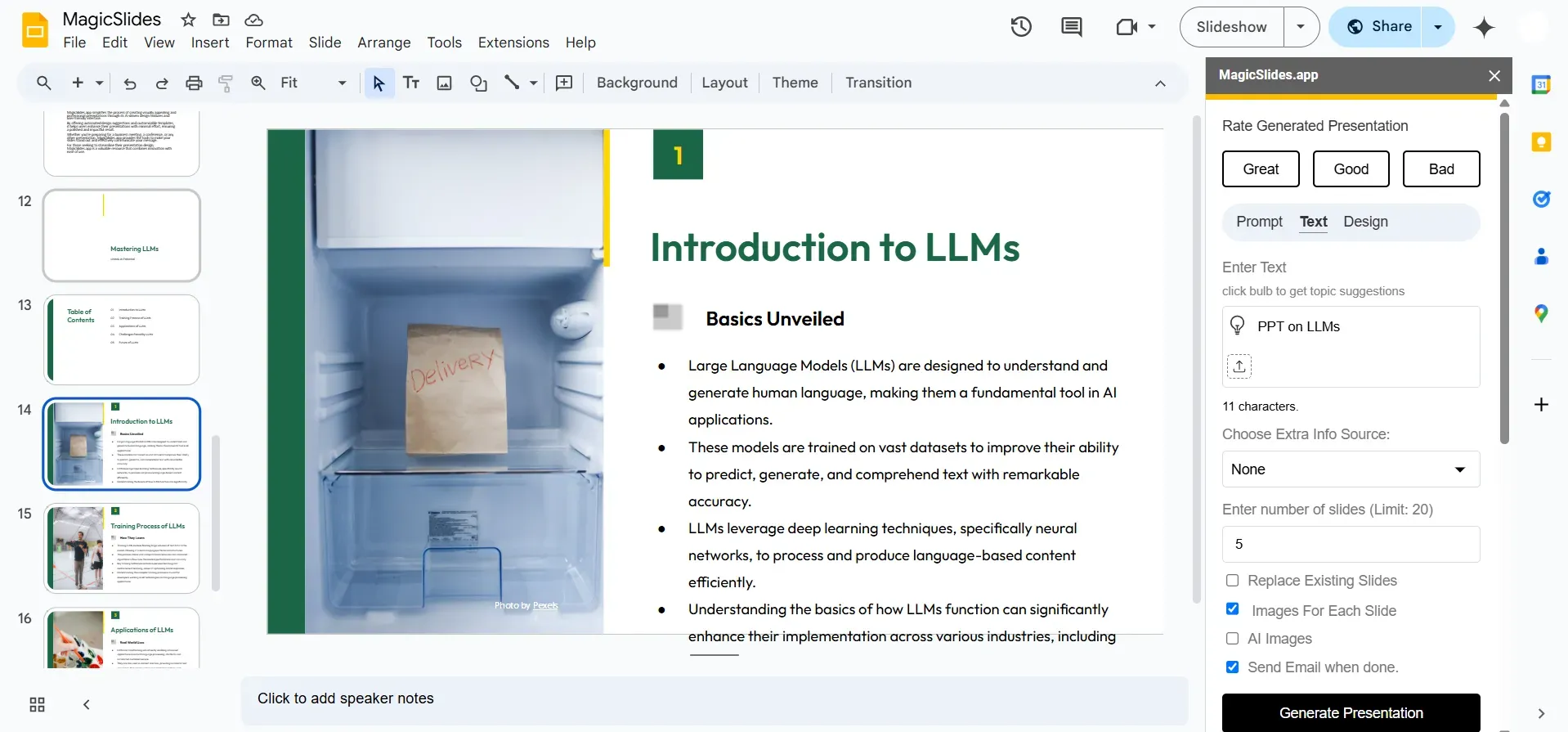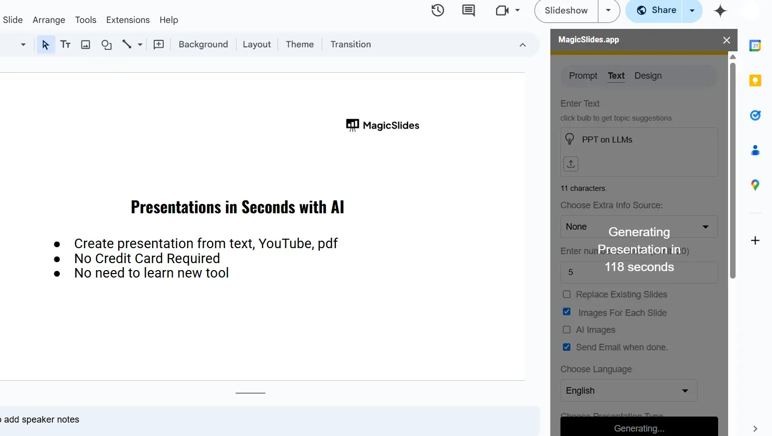 - Use MagicSlides Google Slides Extension if you prefer to generate slides within Google Slides.