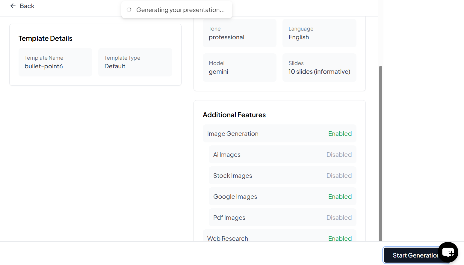 Click ‘Generate Presentation’ – The AI will create structured slides with relevant content and designs.