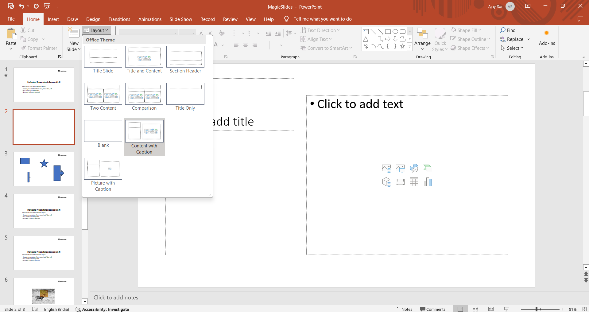 This layout is versatile, allowing you to present a title along with content that can include text, images, charts, videos, and more.