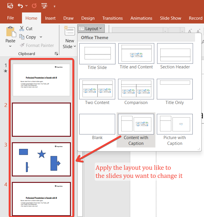 If you want to apply the "Title and Content" layout to an existing slide, go to the "Home" tab, click on "Layout," and then select "Title and Content" from the dropdown menu.