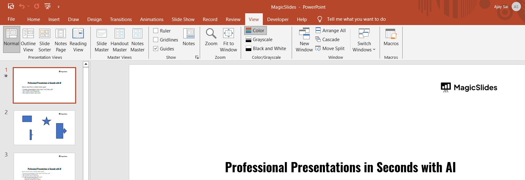- Navigate to the View tab located on the PowerPoint ribbon at the top of the screen.